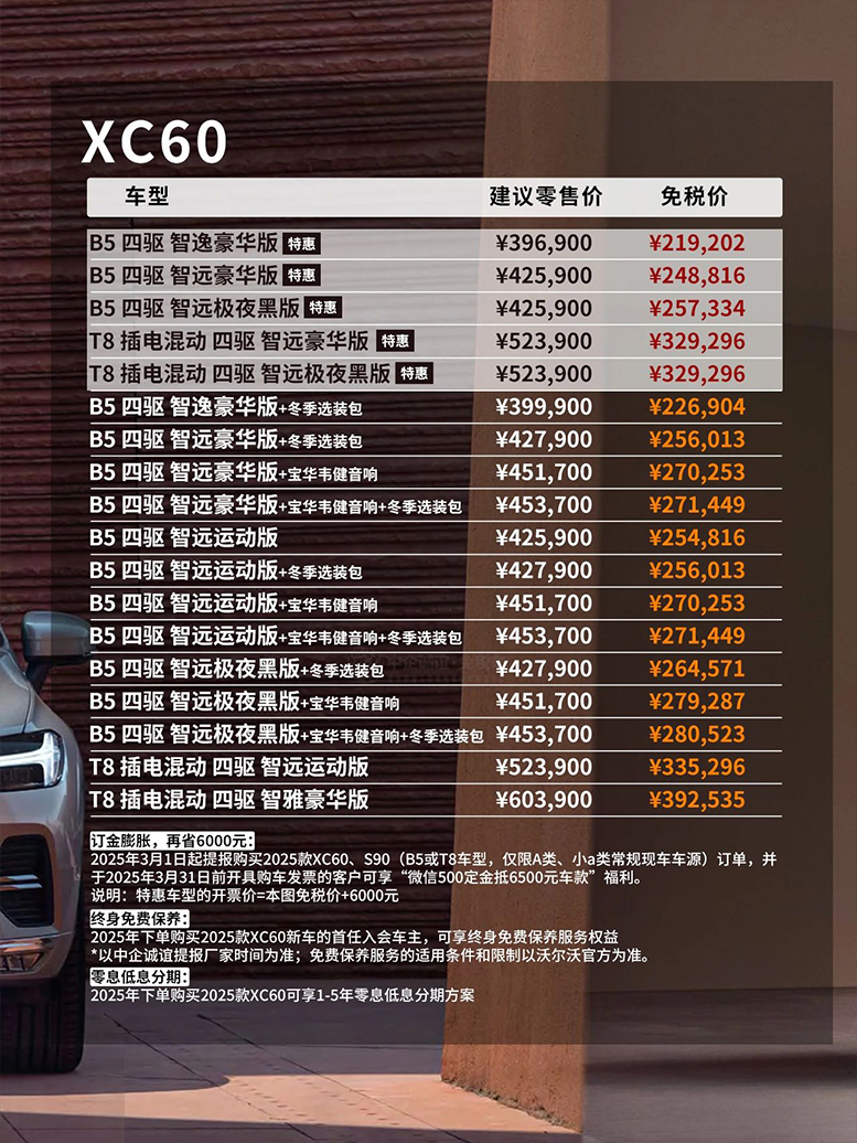 2025年3月1日起提报购买2025款XC60/S90 B5和T8车型(仅限A类小a类常规现车车源)订单,并于2025年3月31日前开具购车发票的客户可享“微信500订金抵6500元车款”福利。