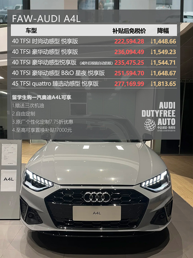 免税价至高再降18300,补贴至高19000|一汽奥迪第三季度留学生免税价更新