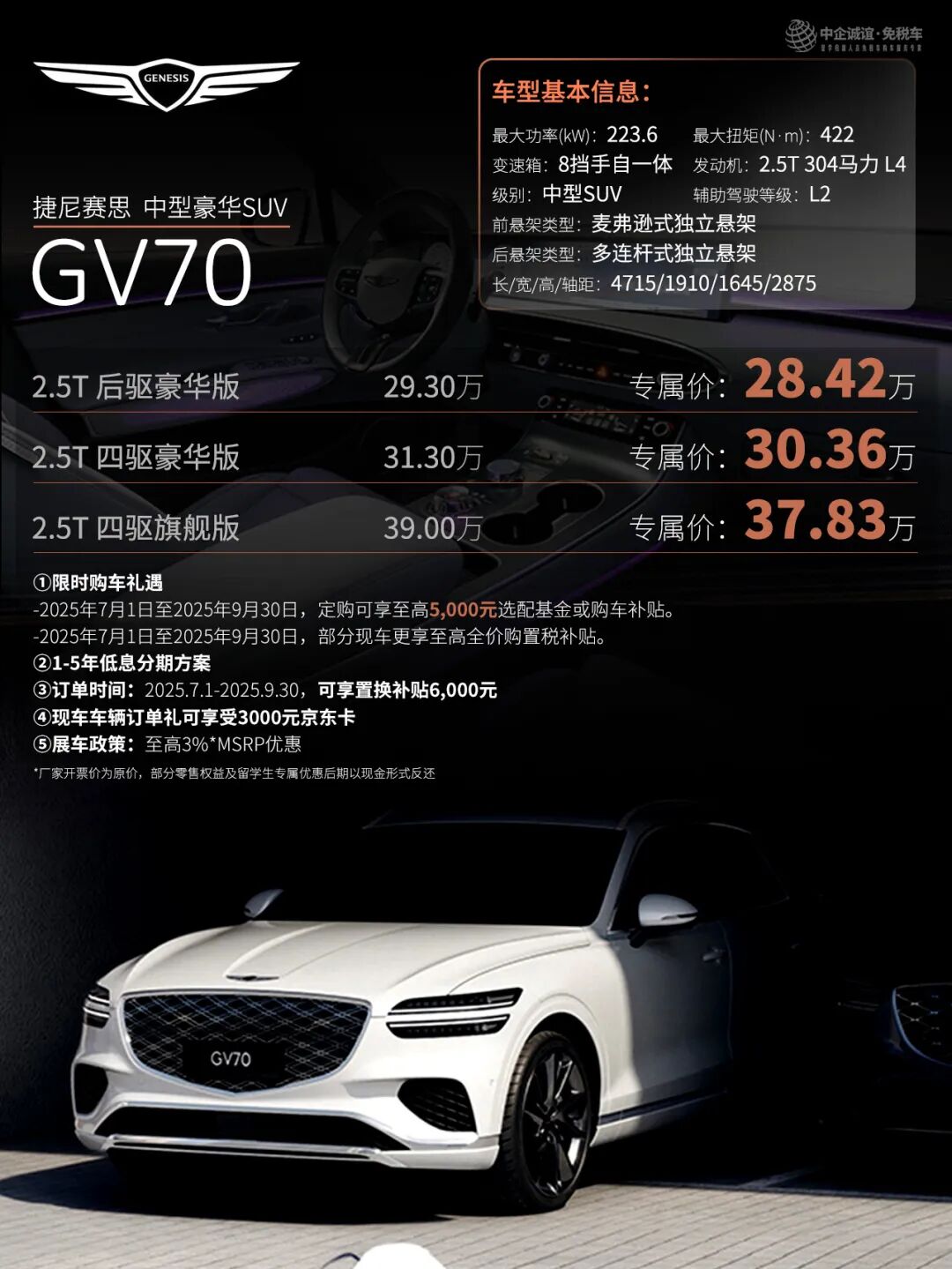 ■捷尼赛思GV70燃油版是一款5门5座中型SUV,有前置后驱和前置四驱两种驱动形式它搭载2.5T涡轮增压4缸汽油发动机,最大功率304马力,最大扭矩422牛·米,匹配8速自动变速箱。