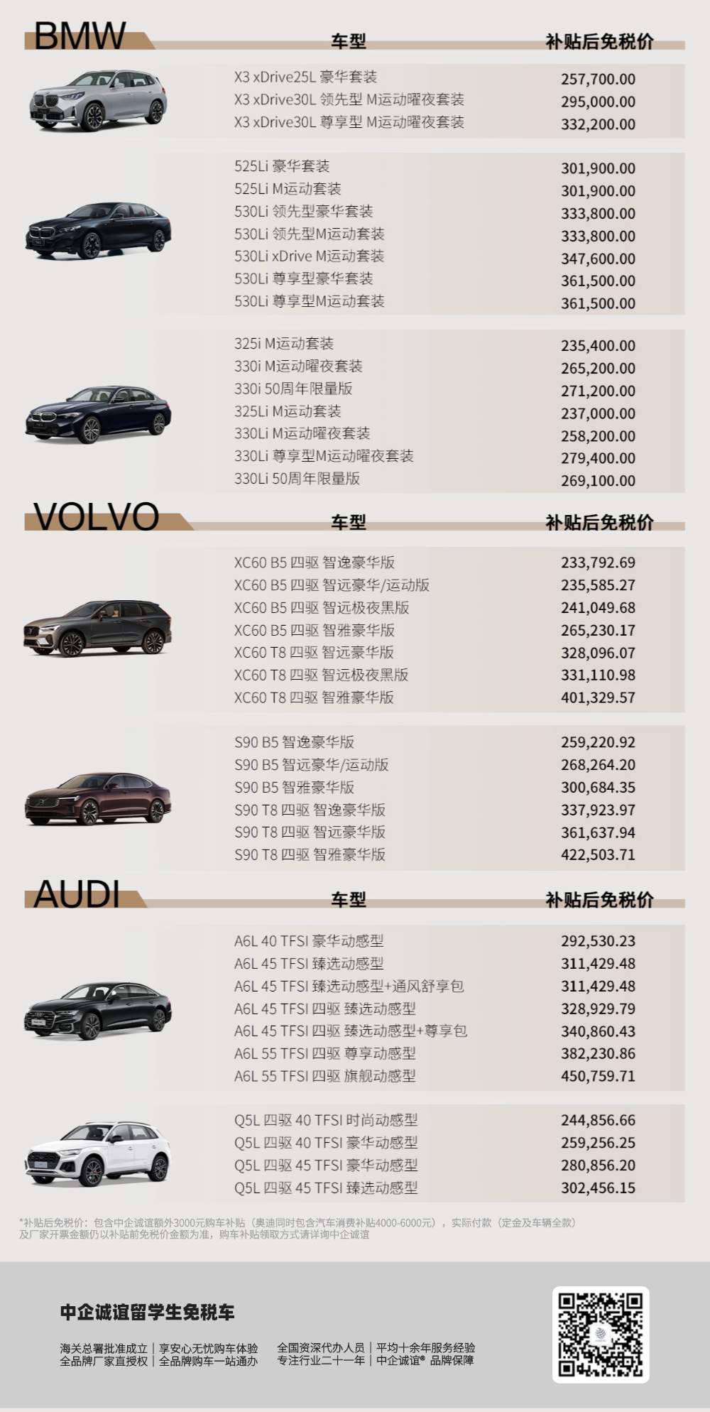 除此之外,沃尔沃和上汽奥迪留学生免税车还有零息服务政策加持,如果钟情于北欧皇室品牌沃尔沃汽车和集科技与时尚于一身的上汽奥迪,那么这将是不错的首选